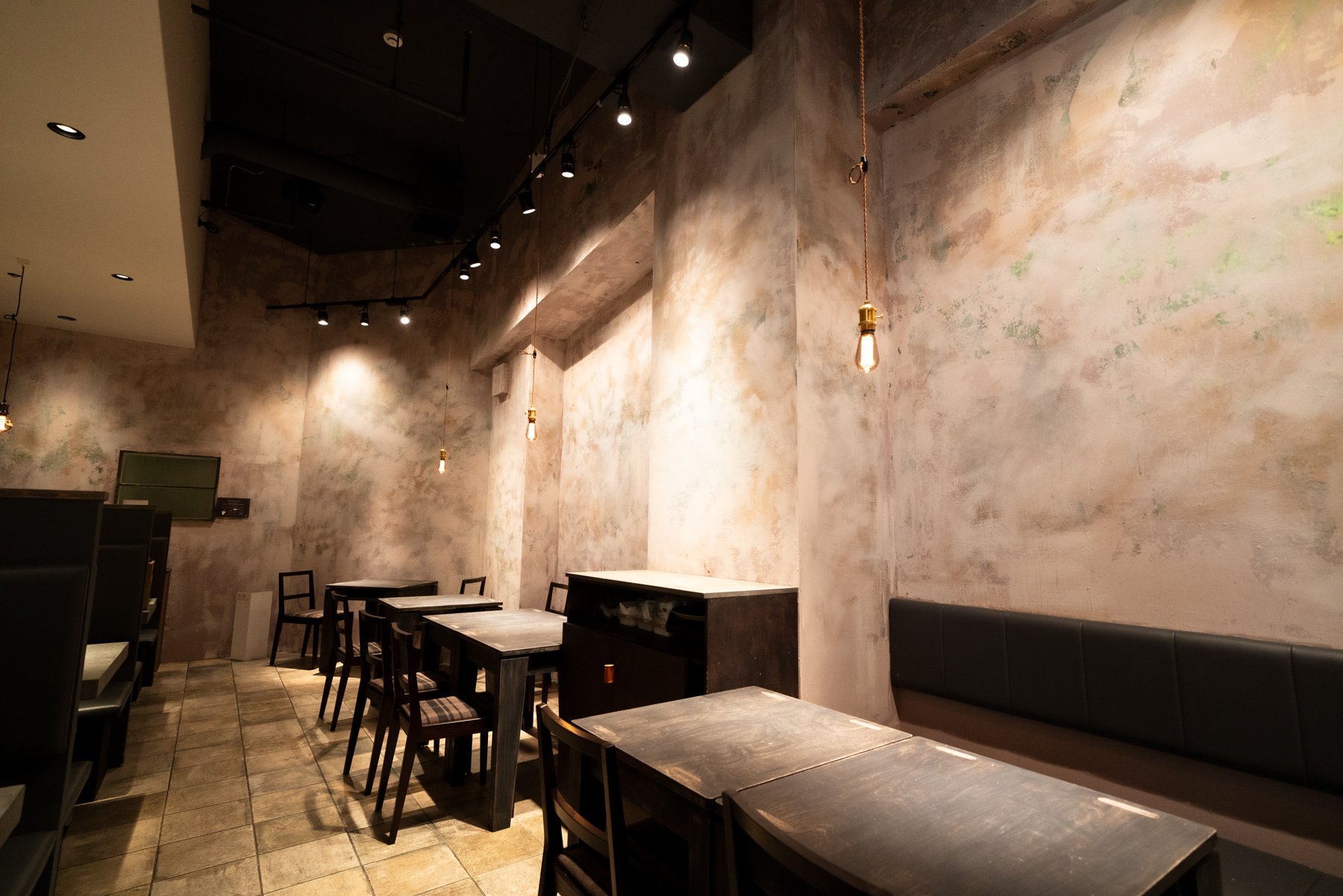 Bistro Roven Shinjuku, the fourth branch of Bistro Roven, opened in Nishi-Shinjuku on December 10, 2021. The forest mural painted on the approximately 4-meter high and 20-meter wide wall is a heartfelt artwork created by our representative. The cozy and warm interior of the restaurant is adorned with hand-painted tables and walls, showcasing a unique and sophisticated ambiance different from our other locations.