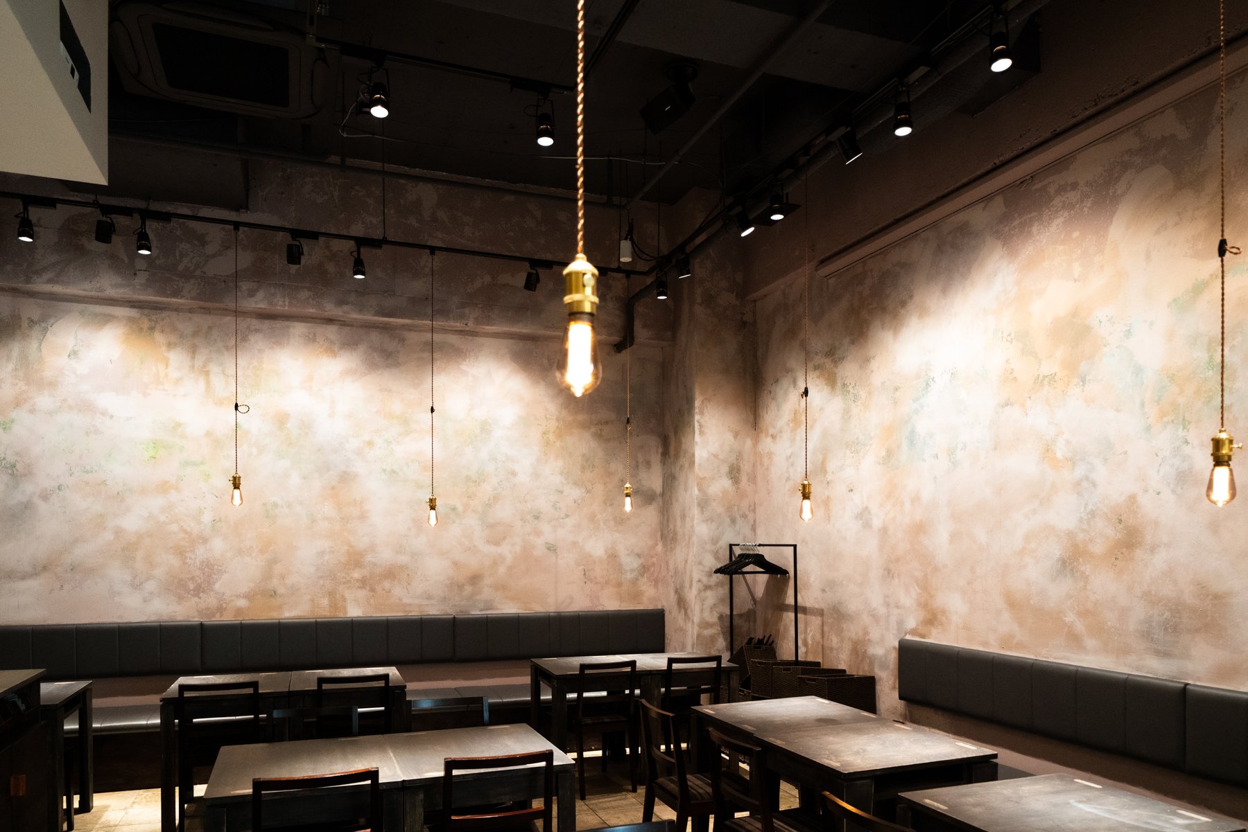 2021年12月10日に、ビストロローブン4店舗目として「ビストロローブン新宿」が西新宿にOPENいたしました。高さ約4m、幅約20mの広い壁に描かれた森は、弊社代表が自ら手で描いた懇親の作品です。店内のテーブルや壁を塗ったり、装飾を施したりもスタッフが行っている手作りの温もり溢れる店内。他店舗とはまた違った落ち着いたシックな空間を楽しめます。