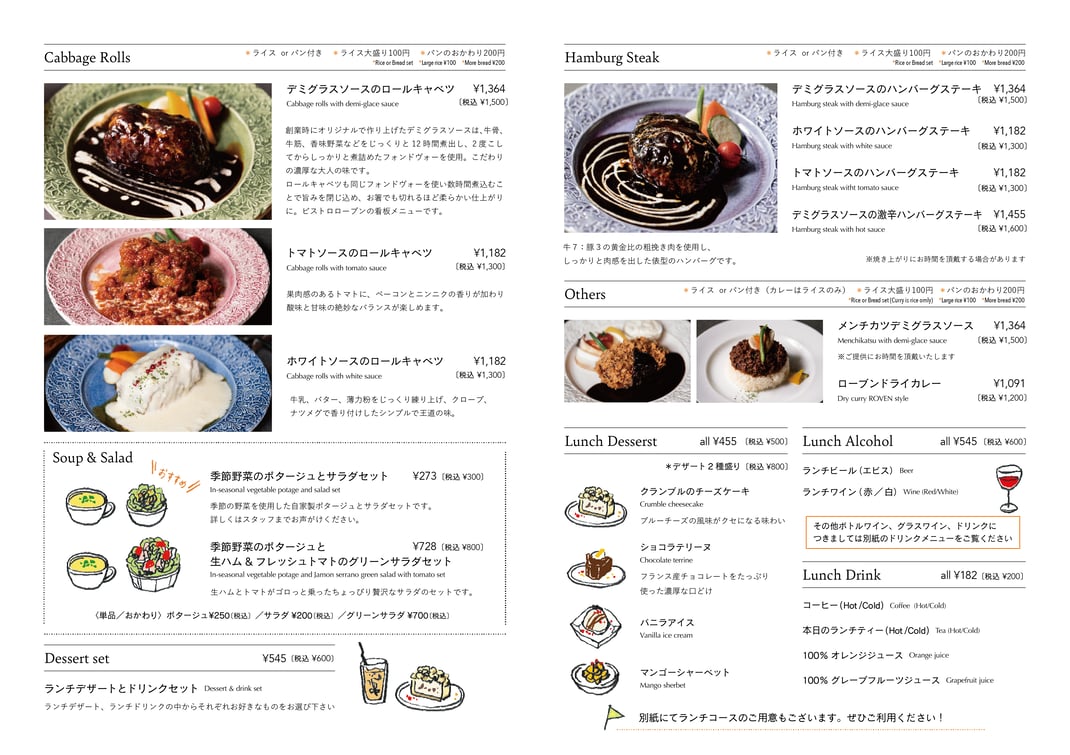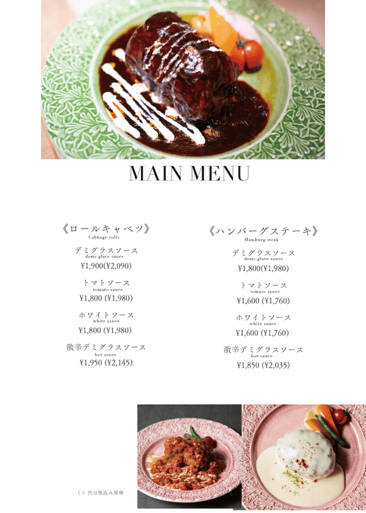 メイン料理は当店自慢のハンバーグ or ロールキャベツ
