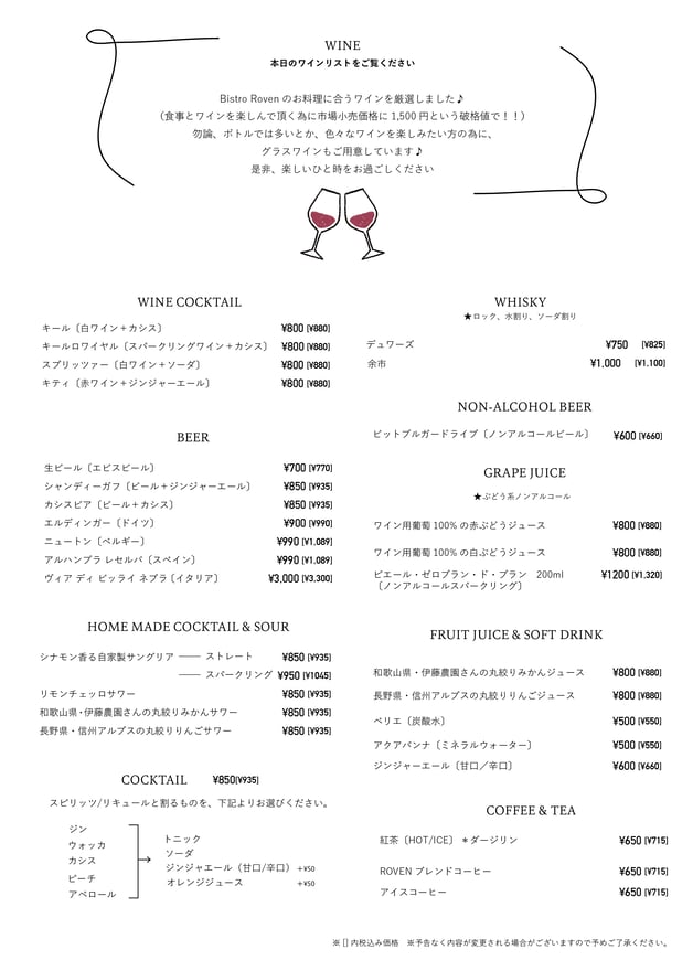 ・ボトルワイン(赤・白 お好みに合わせて4000円相当のボトルワインを2名様につき一本ご提供いたします。4名様なら2本!)